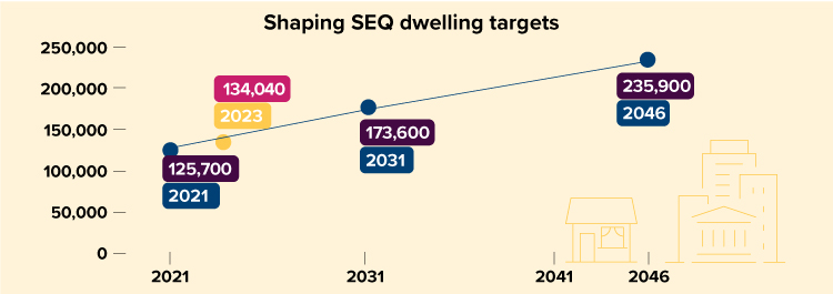 - Logan is currently below our dwelling number targets that are set by the State Government’s SEQ Regional Plan. As at June 2023 the city has 134,040 dwellings moving towards 235,900 by 2046.