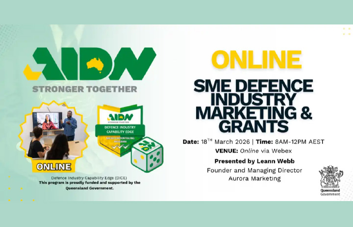 AIDN QLD (Online) DICE Micro-Credential – SME Defence Industry Marketing and Grants Share Mar 18 AIDN QLD (Online) DICE Micro-Credential – SME Defence Industry Marketing and Grants Share 8:00 am - 12:00 pm Free
